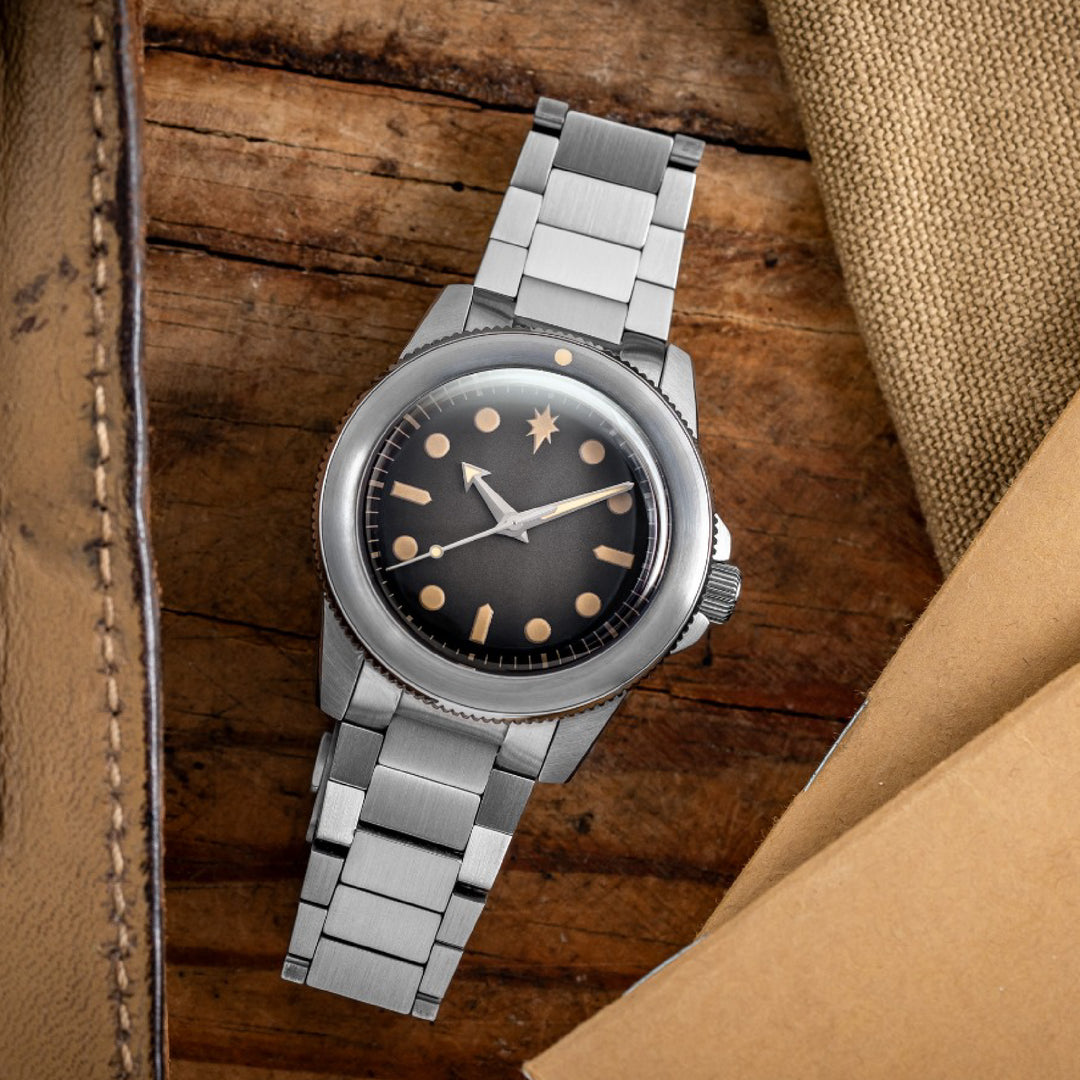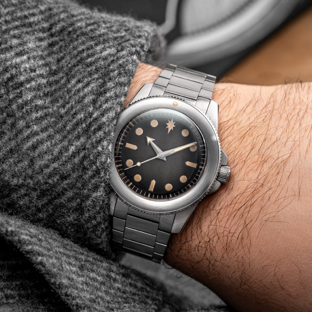 Like with the core Marinor model, we looked at classic 20th-century dive watches for inspiration, focusing on military timekeepers for this design. We highlighted unique elements like the intriguing “anonymous dial” and the “sterile rotating bezel” to create a unique timepiece that references vintage design cues while being built to today's specifications.