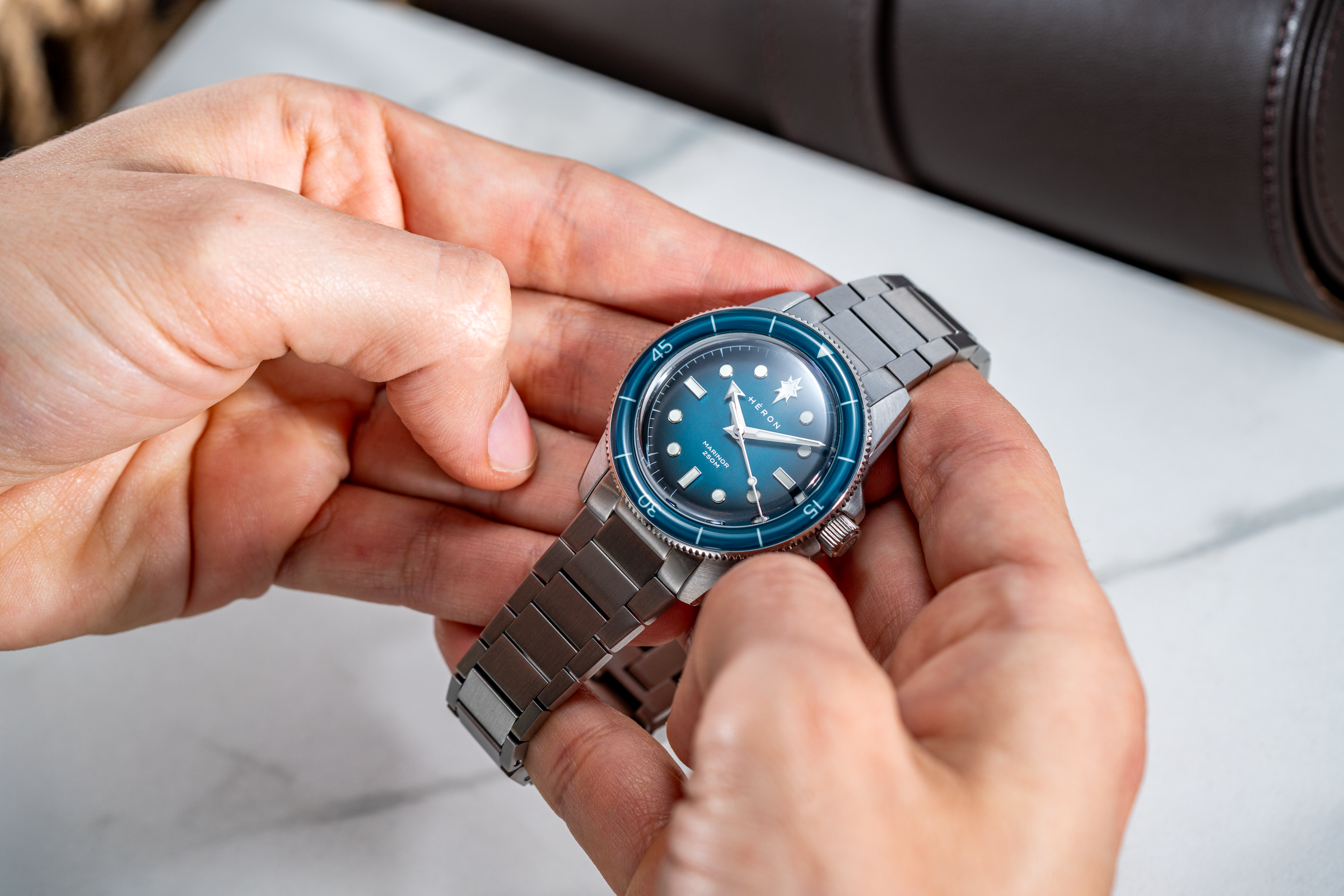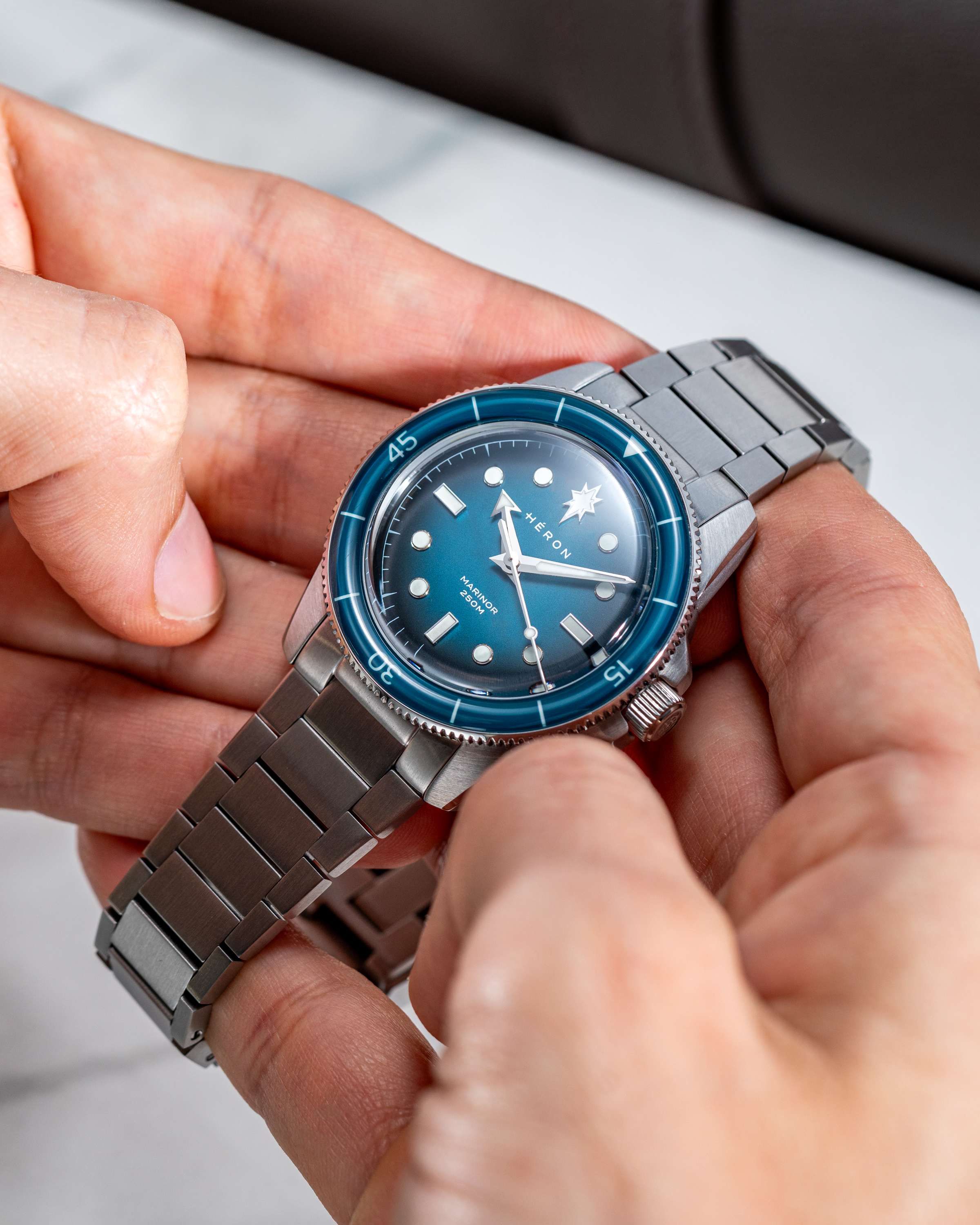 That same approach carries through to the use of sapphire for both the crystal and bezel. Chosen specifically for its hardness, sapphire helps preserve the watch’s surfaces and visual clarity over time, reinforcing the Marinor’s focus on durability where it matters most.