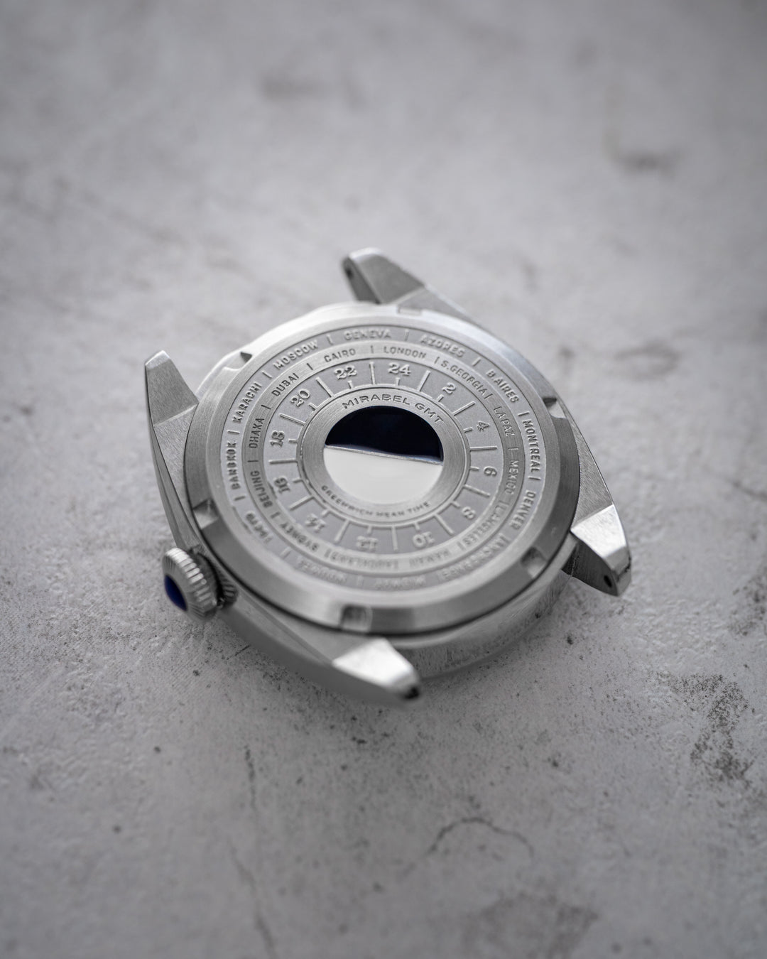 Staying true to Héron's DNA, the Mirabel features a beautifully decorated solid steel caseback. Inspired by Art Deco design, it displays a GMT world timer with each hour corresponding to a city representing its time zone—a tribute to the golden age of travel.